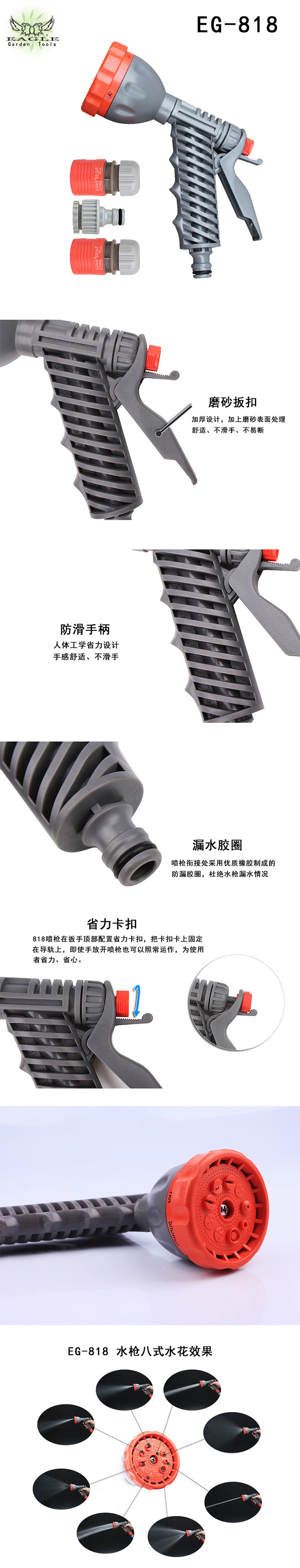 产品介绍:环保ABS+PP+304不锈钢弹簧注塑组成,无异味,色彩鲜艳亮丽,坚固耐压,手感细滑,水枪内置304不锈钢弹簧,防酸性,耐腐,永久防锈,水流通过性好。